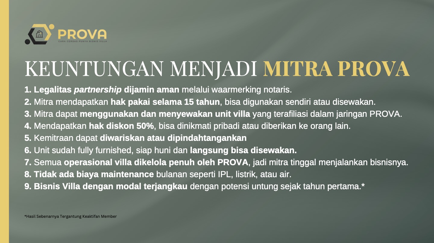 PROVA adalah sebuah platform bisnis villa berbasis sistem kemitraan (partnership) yang memungkinkan siapa saja menjadi bagian dari ekosistem bisnis properti hospitality tanpa harus membeli aset, mengelola langsung, atau menghadapi kompleksitas industri properti.
